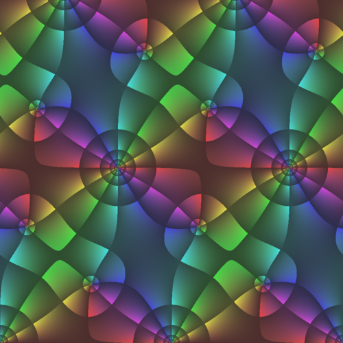 Bokens omslag visar en liknande bild av den så kallade Weierstrass -funktion. Färgerna är valda lite annorlunda än i de ovanstående exemplen. Dessutom har denna bild en gråskalekomponent, som ger information om . Varje ”ring” motvarar en nivåkurva för . De mörkare strålarna som utgår från varje pol och nollställe framhäver variationen för .